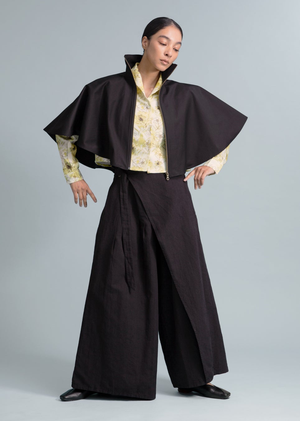 (TOPS) Sculpted Micro Poncho Cotton Chino ¥38,500 (TOPS) Kaname Shawl Collar SH Print Khadi ¥36,300 (BOTTOMS) Sculpted Wrap Pants Linen Khadi ¥44,000
