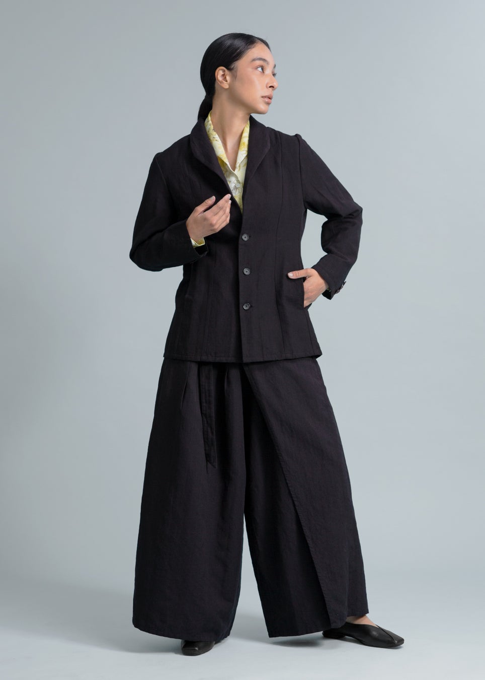 (JACKET) Kaname Slim Long Jacket Linen Khadi ¥46,200 (TOPS) Kaname Shawl Collar SH Print Khadi ¥36,300 (BOTTOMS) Sculpted Wrap Pants Linen Khadi ¥44,000