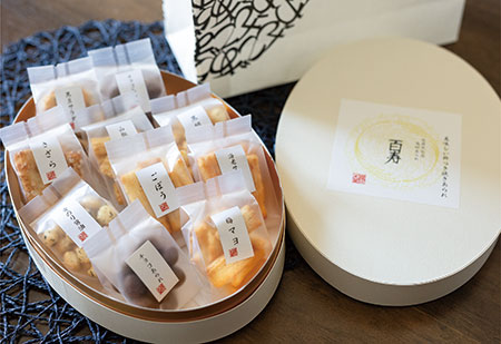 100周年記念限定品「百寿」(3,024円)。米の形の箱に人気の9種を詰め合わせている