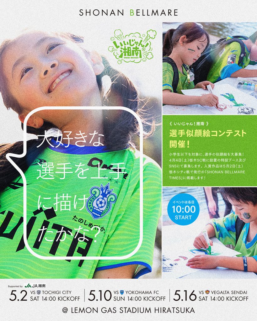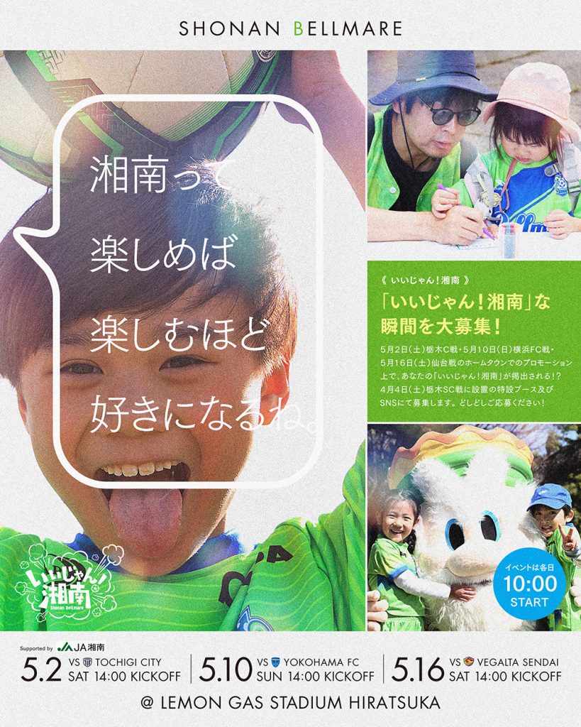 5月2日(土)栃木シティ戦、5月10日(日)横浜FC戦、5月16日(土)ベガルタ仙台戦にて「いいじゃん湘南!」開催!
