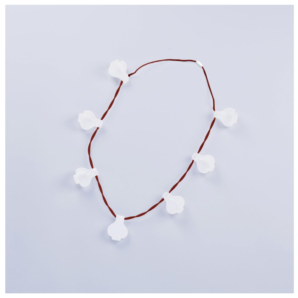 「東京ももクロランド」にまつられている偶像にかかっている、ももたんスカルを首にかけて使用する光るネックレスにしました。ももたんスカル1個1個が常灯と点滅で光ります。発光色はホワイト。