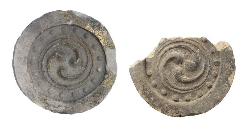 (左)大坂城跡出土瓦 16世紀 大阪市教育委員会蔵 (右)郡山城跡出土瓦 16世紀 奈良・大和郡山市蔵