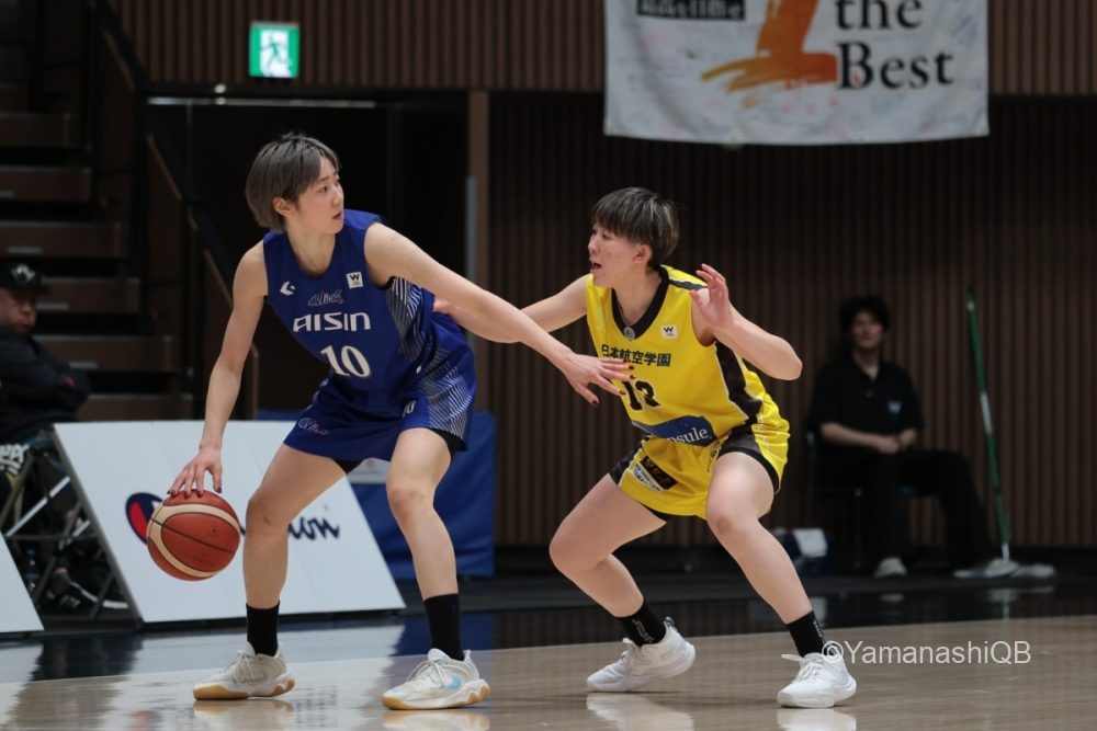 後半、アイシンのディフェンス時に何度も聞こえた「スリーケア」の声が象徴するように、クィーンビーズは前半15点と好調だったスリーポイントが2本6点に抑え込まれた。