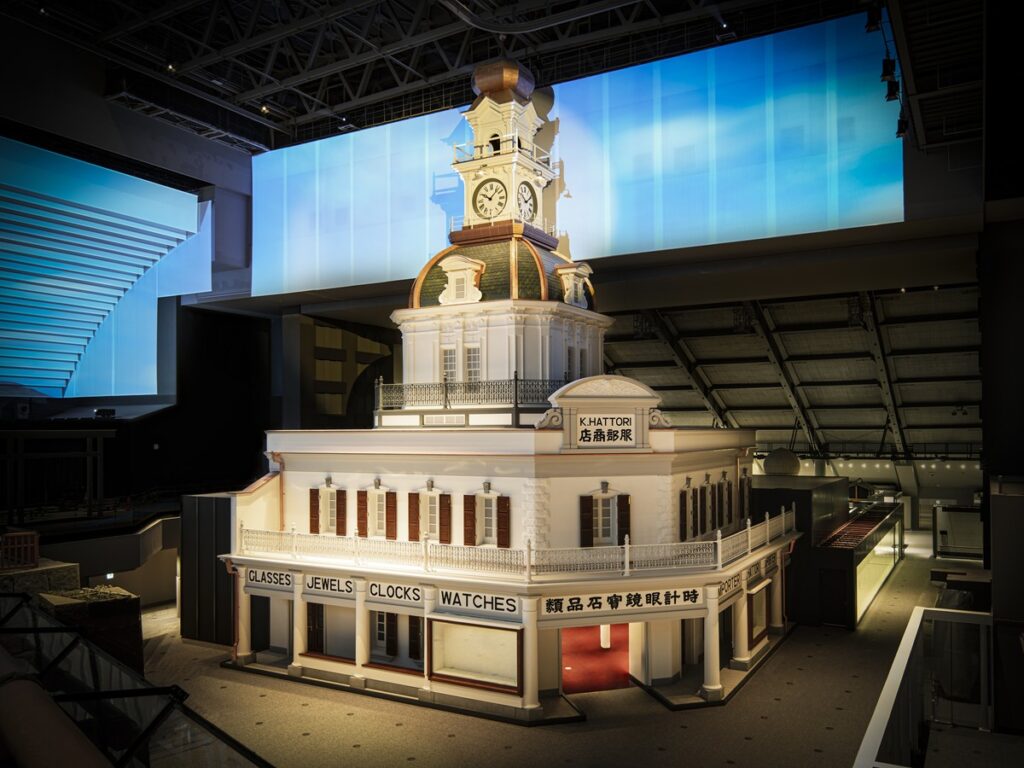 一番は、原寸大の服部時計店。日本橋をわたるときに右手によく見える建物で、以前は「朝野新聞社」だったものを、初代の「服部時計店」に変えました。高さがぎりぎりなんですよ。(話を聞いた後に、実際のぎりぎりさを見てびっくり!!)