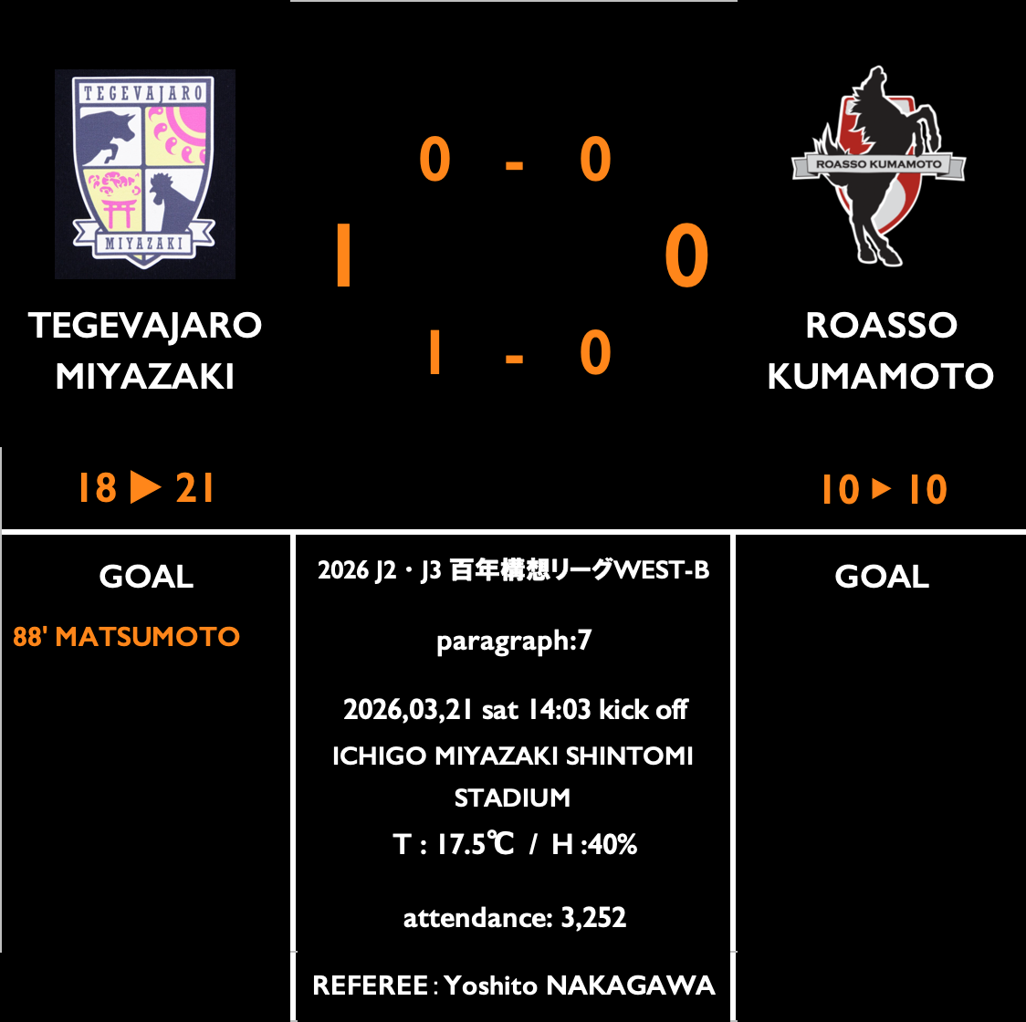 5年ぶりの対戦となった宮崎との一戦。ボール保持率やシュート数にも表れている通り、内容的には優位に進める時間も短くないゲームだった。しかし結果につなげることはできず、終盤の失点で3連敗。PKで敗れたものの勝点1を加えた鳥取に抜かれ、WEST-Bで5位に後退する結果となった。