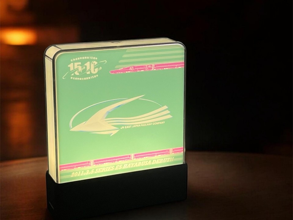 開業周年ロゴとE5系・H5系の車体ロゴを表面・裏面デザインにそれぞれあしらった両面仕様のインテリアライト。1台で両車両のデザインを楽しめて、据え置きでも壁かけでも使用できる。受注期間は5月6日までで、発送は6月以降順次行なう予定。