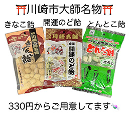◇家傳開運のど飴、開運とんとこ飴、名物きなこ飴等川崎大師名物の飴:各種330円(税込)