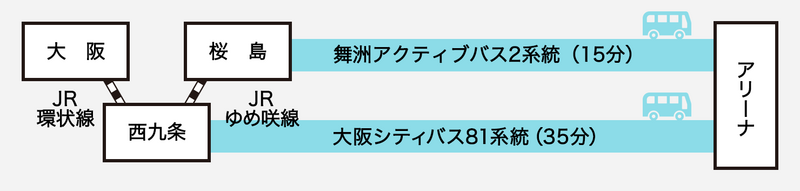 ・JR環状線 西九条駅でJRゆめ咲線へ乗換え、桜島駅下車、舞洲アクティブバス(2系統)に乗換えおおきにアリーナ舞洲前下車