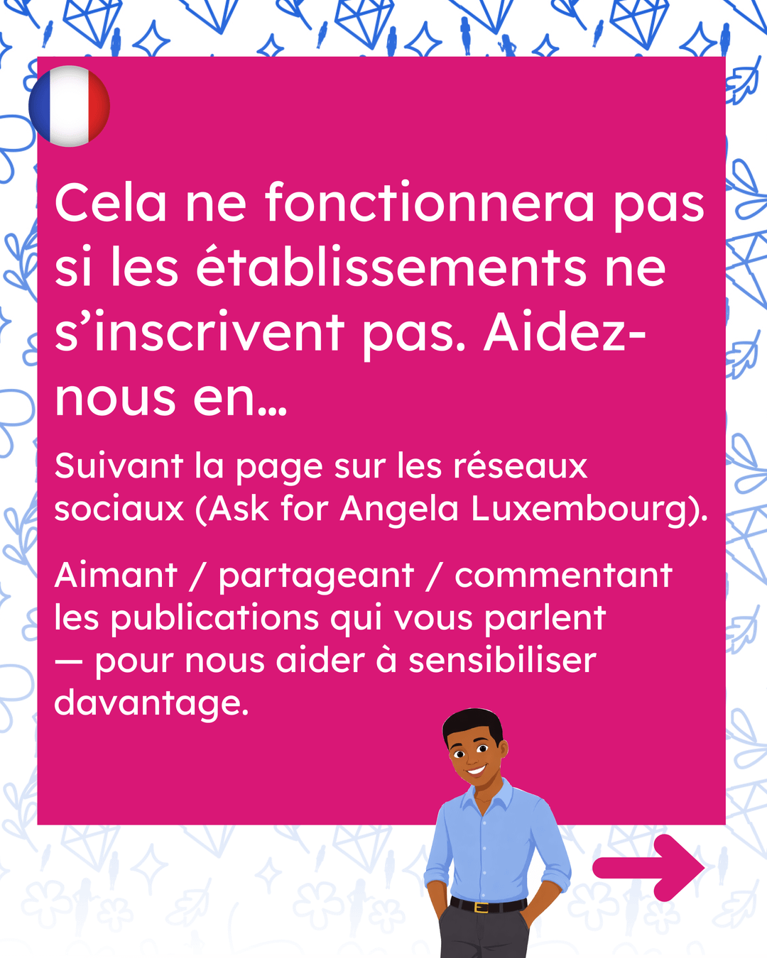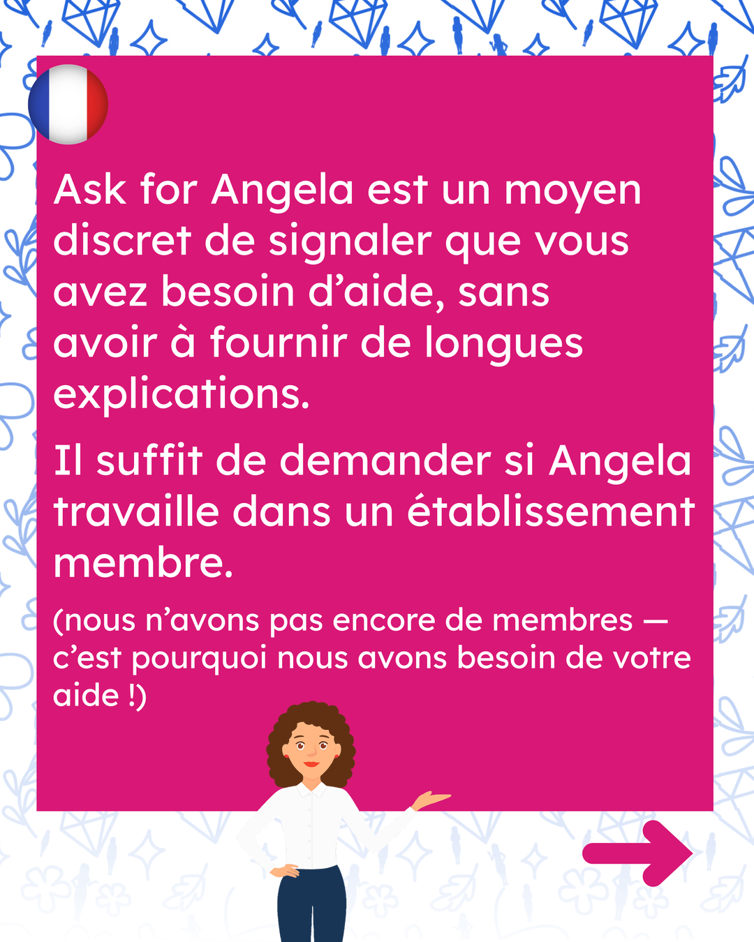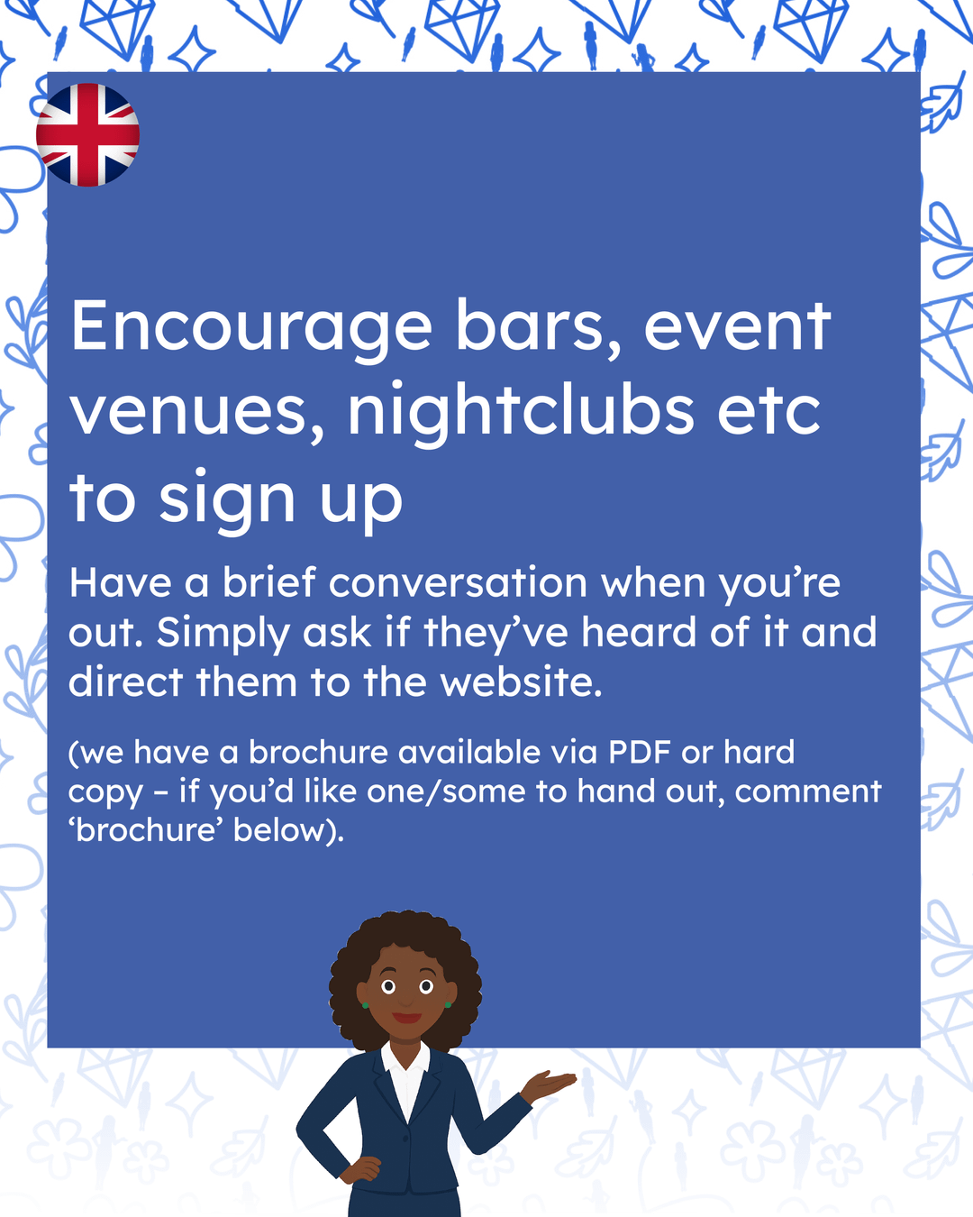 2. バー、カフェ、ナイトクラブなどのスタッフと仲が良い場合は、参加するよう勧めてください。当社のソーシャル メディアにはたくさんの情報があります。 アンジェラのウェブサイトを問い合わせる、そして、 会場用パンフレット