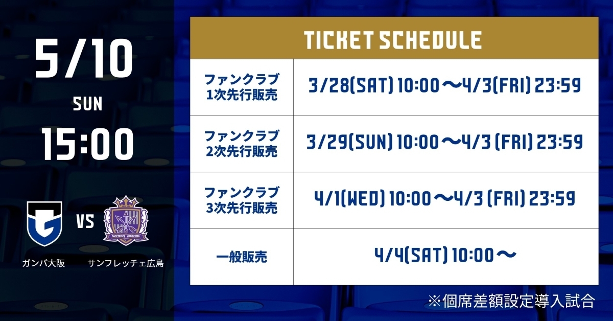 ※2:ファンクラブ先行販売は事前にワンタッチパスID設定が必要となります。(すでにご登録いただいている方は登録の必要はございません。)設定方法:https://www.gamba-osaka.net/c/ticket/fanclub_presale.html