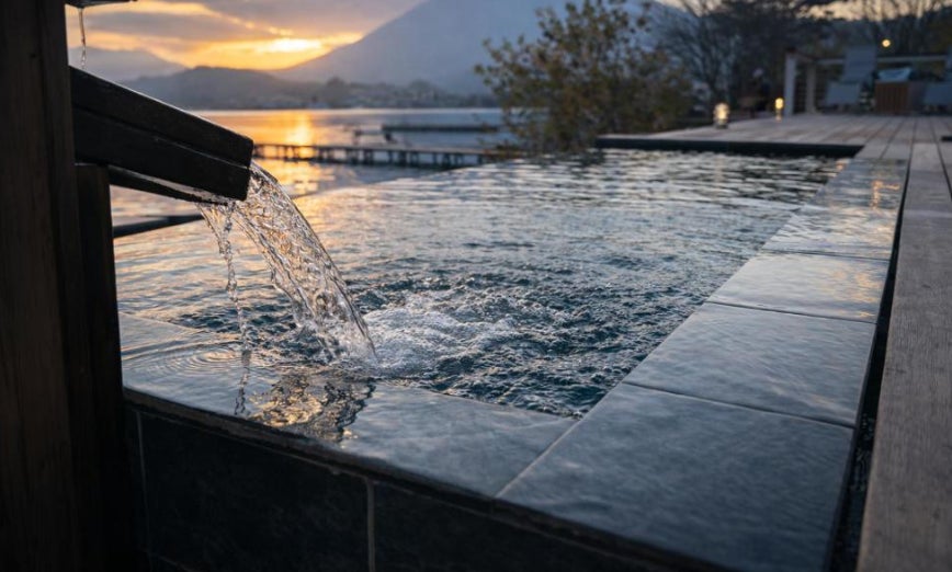 湖畔を眺めながらはいる本格ジャグジーや天然地下水掛け流し冷たい水風呂を体験可能です。周りにはほぼ何もない、目の前に広がる湖の絶景朝焼けに染まる静かな湖面、日中のきらめく水面、夕暮れに溶ける山影、そして夜の深い静寂と満天の星空まで…。時刻と季節ごとに表情を変える野尻湖の絶景を、特等席で優雅にお楽しみいただけます。