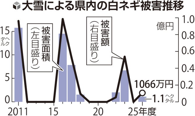 だが、緩和された規格を満たさないものも発生。県のまとめによると、今冬は例年以上の大雪となり、同市を中心に約1・1ヘクタール、約1100万円の被害が出た。雪が早く解けたことで被害は軽かったものの、主に業務用のカットネギなどの加工商品に回すか、廃棄するかを余儀なくされた。毎年雪害による損失を見越しているとはいえ、売り上げ減少とともに処理の費用も負担することになった。