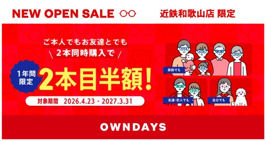 OWNDAYSでは、「NEW OPEN SALE」終了後の2026年4月23日(木)から2027年3月31日(水)まで、毎回ご好評をいただいているオープンキャンペーン「2本目誰とでも半額割」を開催いたします(※2)。