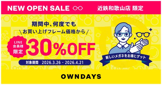 2026年3月26日(木)から2026年4月21日(水)までの期間、近鉄和歌山店をご利用いただくお客様を対象に、6,000円(税込)以上フレームが表示価格から30%OFFとなる「NEW OPEN SALE」を実施いたします(※1)。本キャンペーンは、OWNDAYS公式LINEアカウントへのご登録を条件に、期間中、何度でもご利用いただけるお得な内容となっています。この機会にぜひご利用下さい。