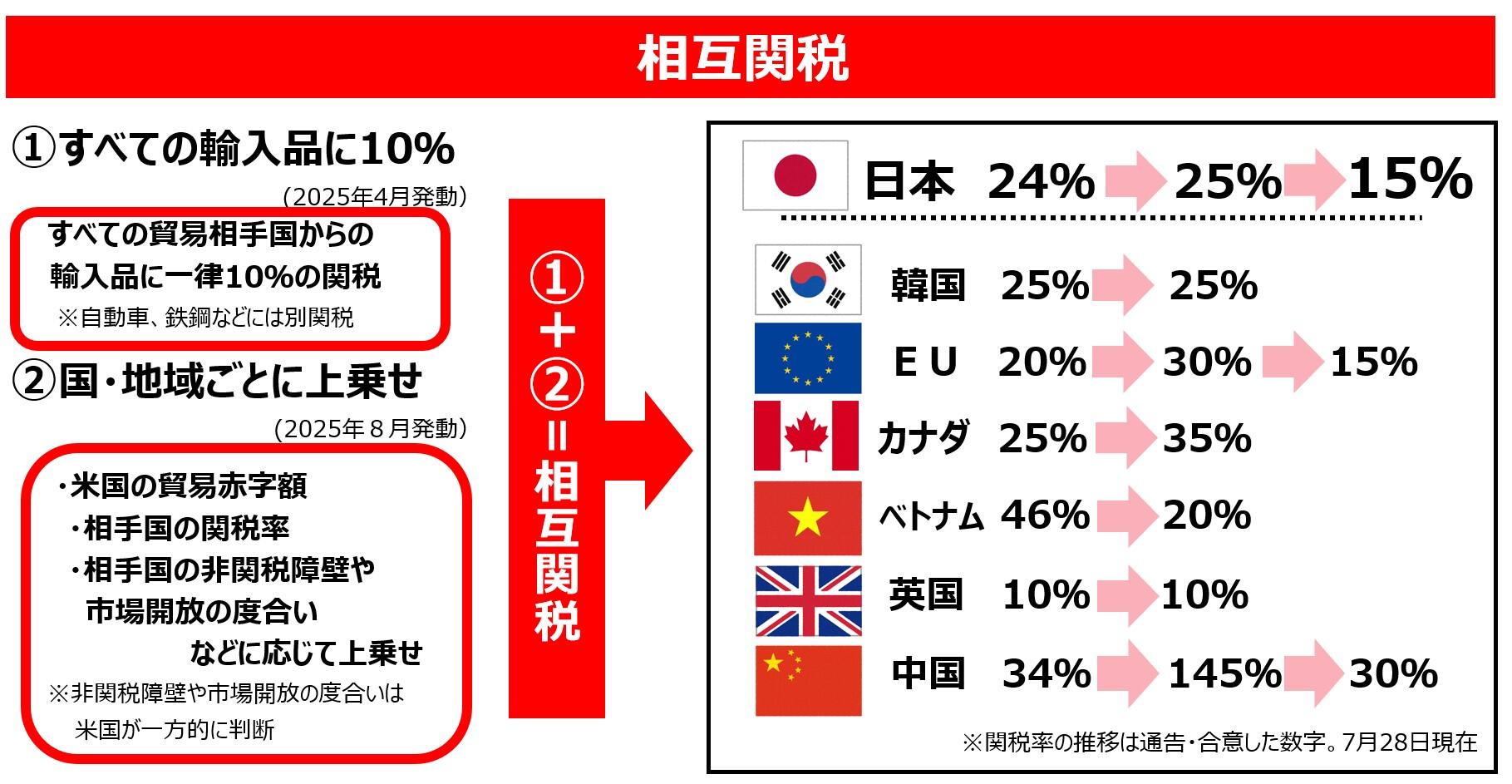 日本については、4月時点では一律10%の税率をかけた上で、さらに14%を上乗せして24%の相互関税を課すとされましたが、その後、トランプ大統領は「日本が市場開放を約束しなければ、25%の相互関税を8月1日から適用する」と通告していました。合意した相互関税15%(一律10%と上乗せ分5%の合計)は通告より10%低くなっています。もともと15%を超える税率だった製品には5%の上乗せはありませんが、関税がほとんどかかっていなかったお茶や日本酒などには新たに15%の関税がかけられます。