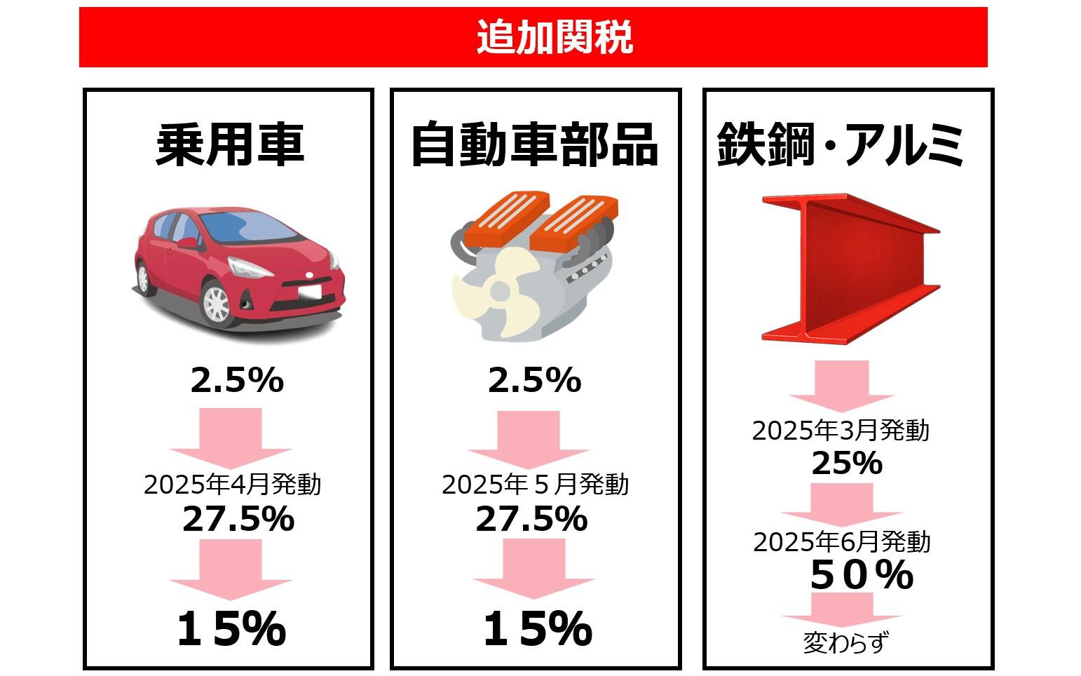 一方、追加関税は、米国が重要な産業を守るため、海外から安い製品が入らないように、国単位ではなく製品単位で税率を追加するものです。2025年4月以降、米国は乗用車・自動車部品に25%、鉄鋼・アルミニウムに50%の追加関税を課してきました。