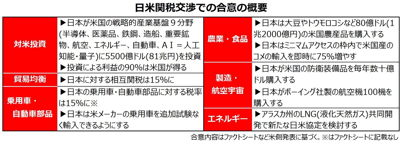 日本は相互関税と追加関税を引き下げてもらうため、米国への投資、米国の製品や農産品の輸入拡大を約束しました。関税交渉の合意事項には関税率以外の項目が含まれています。