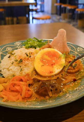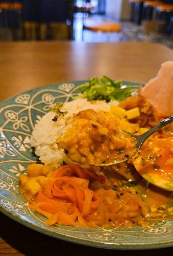 女性ファンも多いという「海老カレー」をいただきました。爽やかな彩りが印象的な、ココナッツミルクをベースにした、アジアンテイストのカレーです。