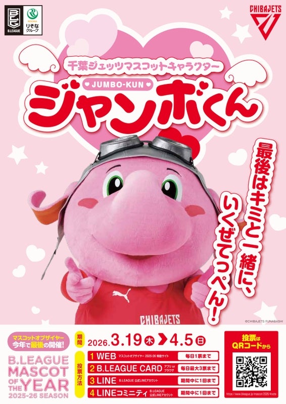 今のBリーグマスコット界は戦国時代!どのクラブも熱狂的な応炎を背負っており、一筋縄ではいかない厳しい戦いです!! そして何より今大会は「Bリーグマスコットオブザイヤー最後の大会」となります!! 今シーズンの「千葉ジェッツ」リーグ優勝に勢いをつけるべく、その前哨戦としてジェッツの象徴となりつつある「ジャンボくん」を皆さまと一緒に「優勝」をさせましょう!!優勝への道は、皆さまが毎日積み上げてくださる1票の先にしかありません!ご家族やお友達のパワーを借りつつご参戦くださいませ。
