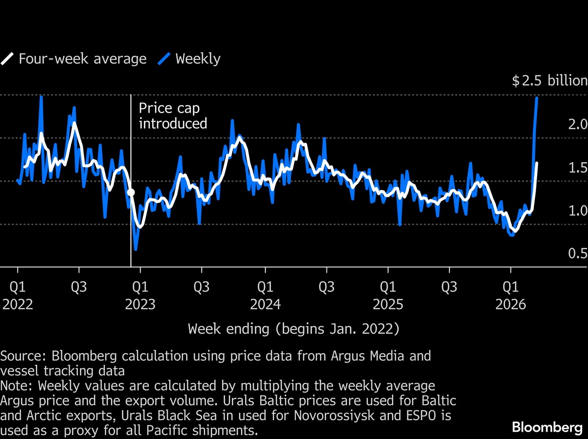 原油価格の上昇が一因となり、ロシアは2022年のウクライナ侵攻直後以降で最大の石油輸出収入を得ている。米国とイスラエルがイランへの軍事行動を開始する前は、世界的な価格下落を背景にロシアの石油収入は減少傾向にあった。