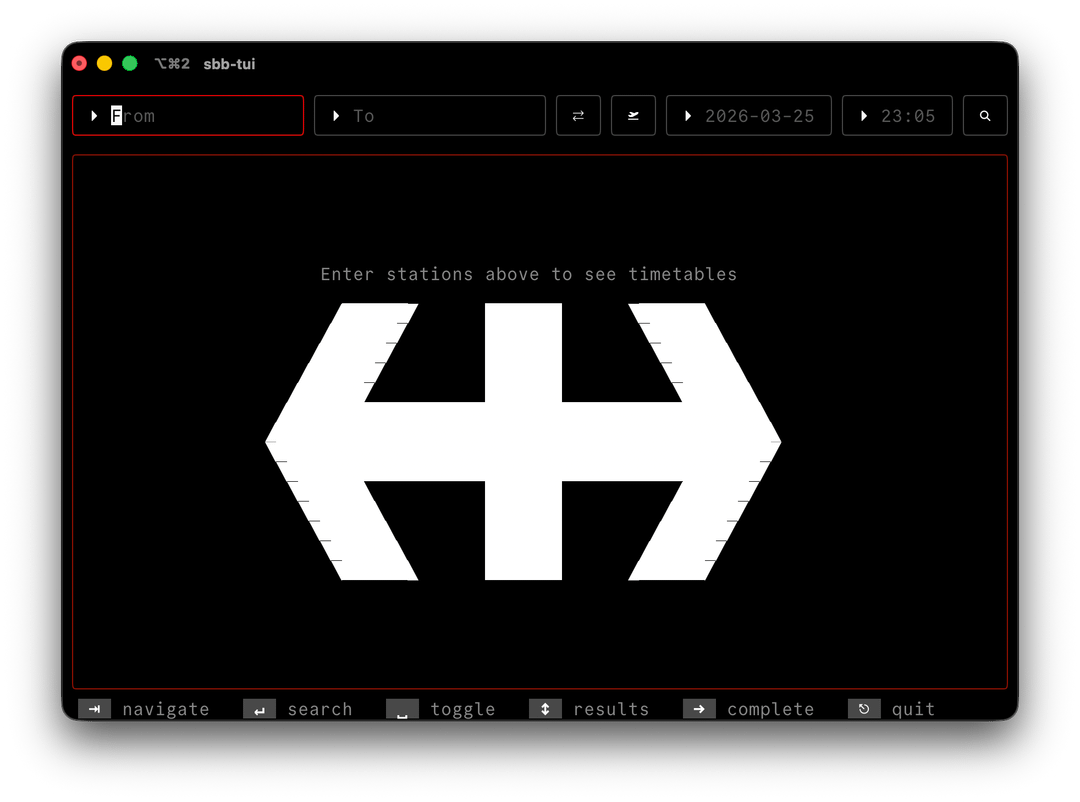 SBB-TUI スイスの公共交通機関の時刻表の TUI クライアントです。SBB/CFF/FFS アプリ/ウェブサイトからインスピレーションを受けており、$HOME で直接使用できます。