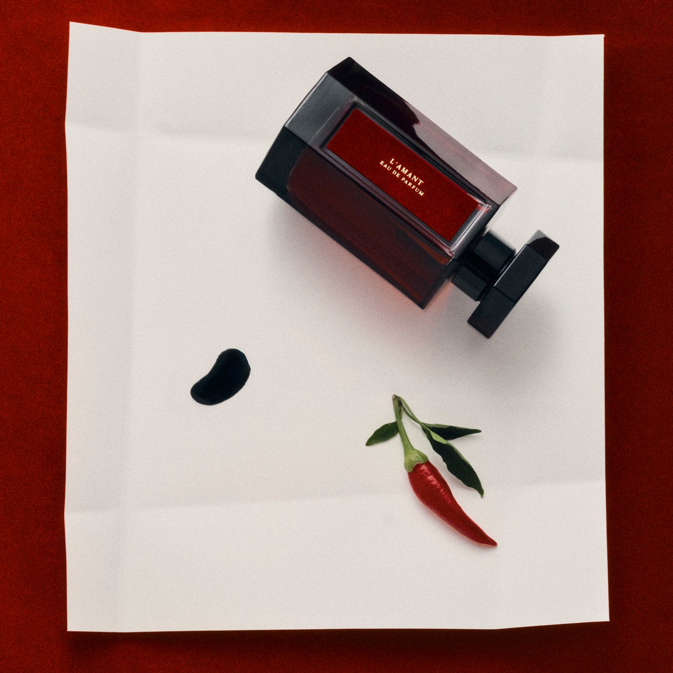 最初に立ち上るのは、灼けつくような赤い色をしたピメントリーフのシャープな辛み。それは一瞬にし て燃え上がる恋の火花のよう。ミネラリーなレザーアコードはインクのような深みで肌に欲望の刻印を残す。そしてこの2つの香りをつなぐパチョリは、告白と秘密の間に横たわる隙間を暗闇が白い光を浸食するように一つにしていく。やがて影の中からシプリオール、サンダルウッド、ヴェチバーが姿を現し、親密さを込めてそっと肌を包み込む。その香りの抱擁は、禁忌めいた余韻を静かに引き延ばし、心をとらえて離さないのです。