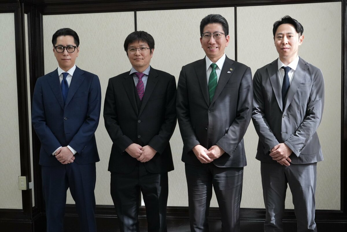 左から じぇいそる氏、木原直哉プロ、下鶴市長、矢倉賢一代表