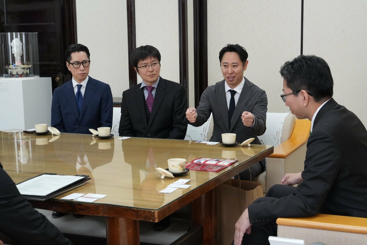 鹿児島市役所を訪れたのは、一般社団法人ニッポンシリーズ(東京)の矢倉賢一代表、同法人エグゼクティブディレクターでプロポーカープレイヤーの木原直哉氏、同法人でプロポーカープレイヤー兼YouTuberじぇいそるとして活動する矢倉高士氏の3人。