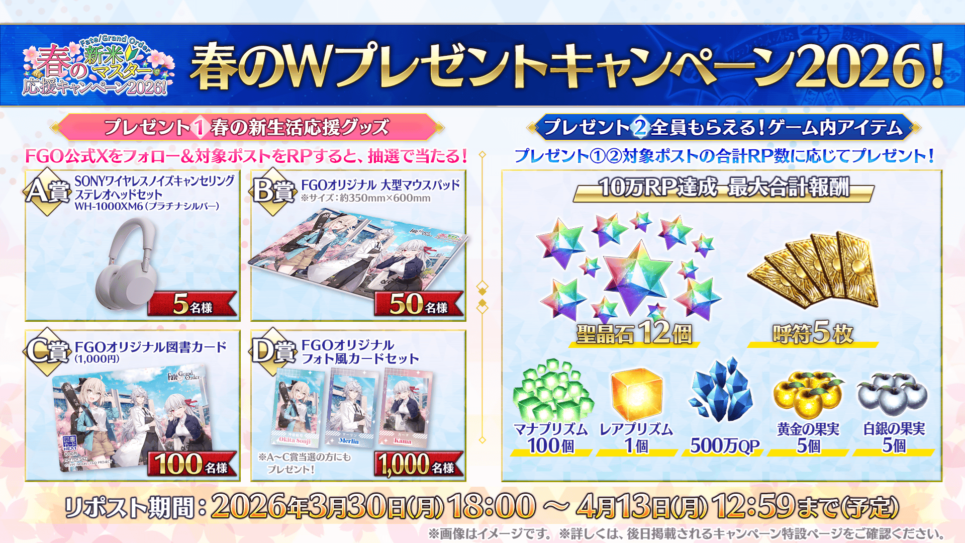 また、「①春の新生活応援グッズ」と「②全員もらえる!ゲーム内アイテム」の対象ポスト2件の合計リポスト数が「最大10万リポスト達成」で、ゲームをプレイしているすべてのマスターに、聖晶石12個や呼符5枚などの豪華ゲーム内アイテムをプレゼントいたします。