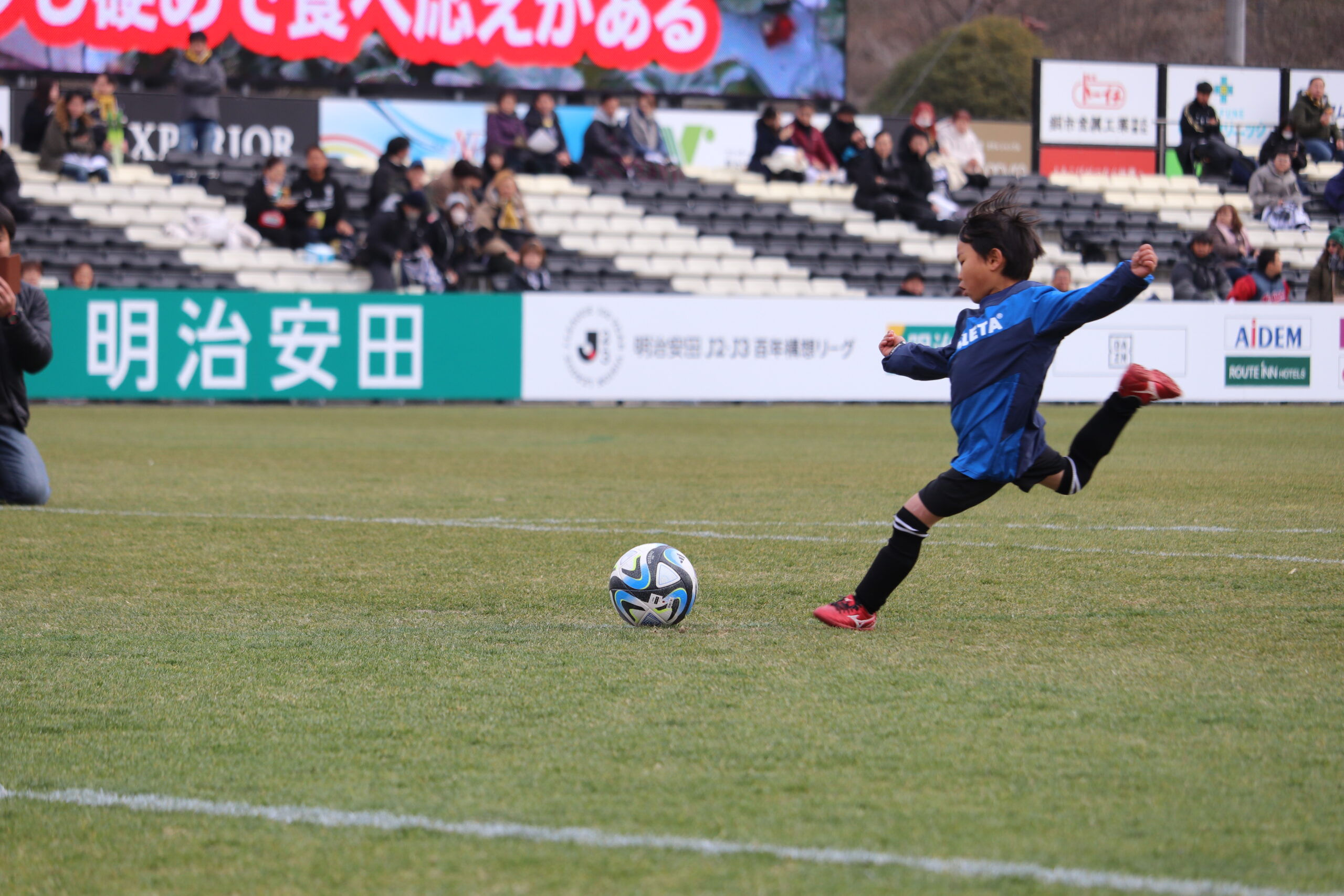 試合前のピッチで栃木シティのゴールキーパーへ向けてシュート!!