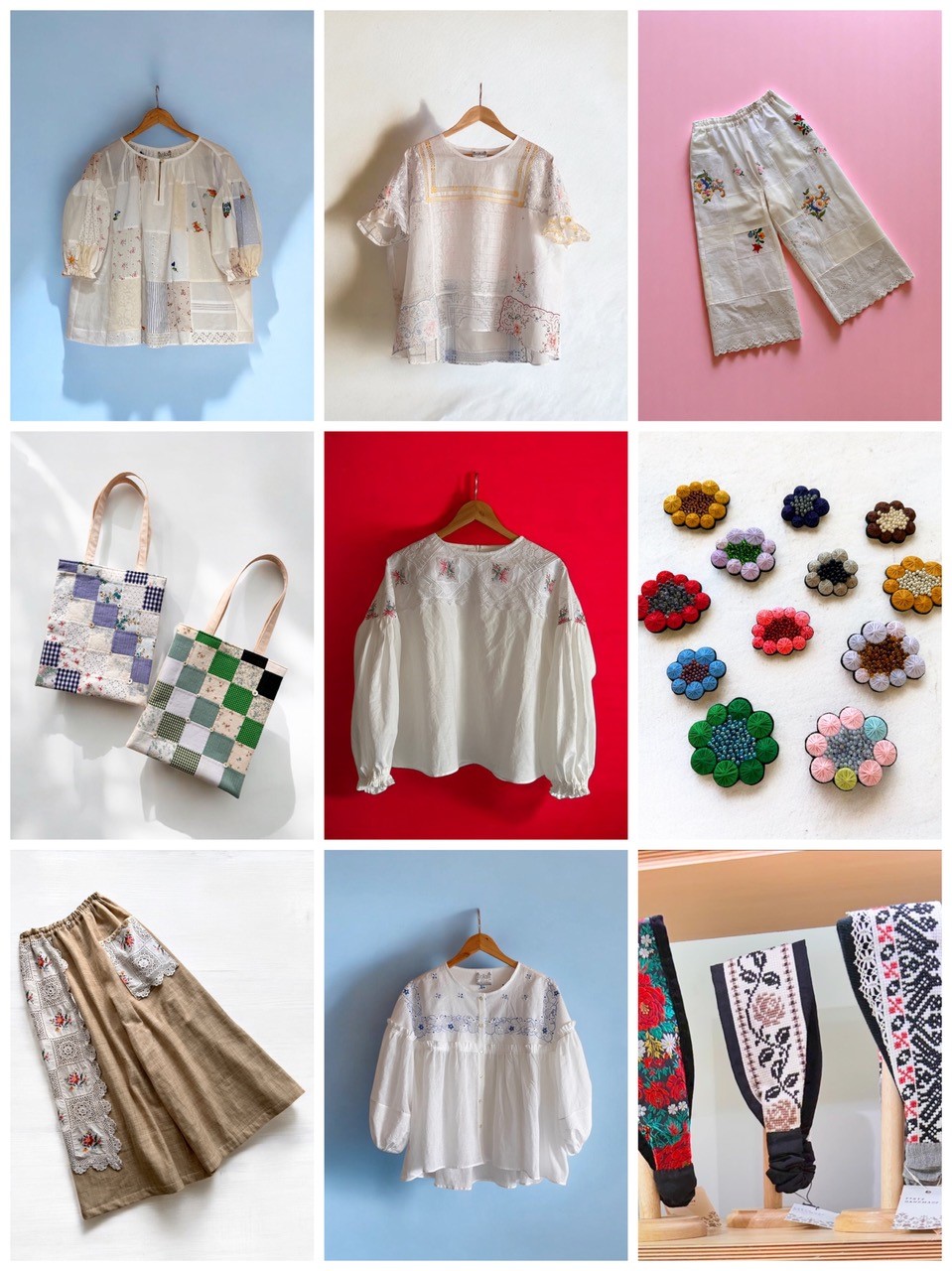 ヴィンテージのハンカチやテーブルクロスをリメイクしたお洋服や、
