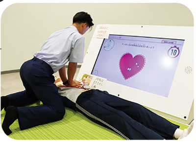 救命処置が体験できます。モニターに映し出されるハートマークを確認しながら上手く人形に心臓マッサージをします。