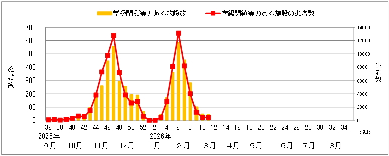 2026年第11週に学級閉鎖等5のあった保育所・学校等は43施設、患者数は424名でした。