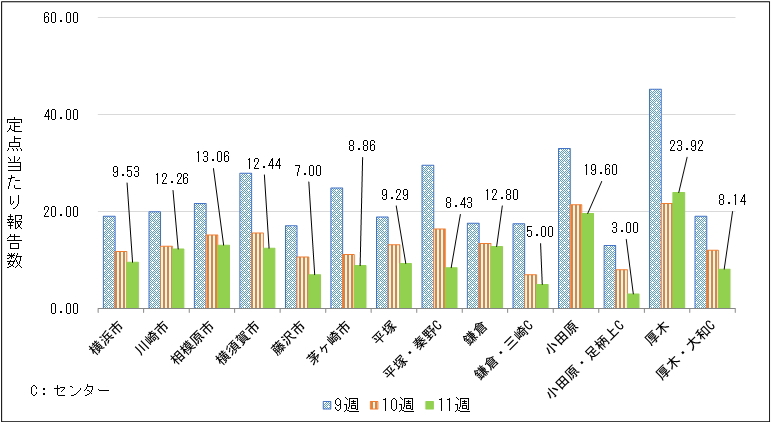 厚木保健福祉事務所を除き、全ての保健福祉事務所・センターで前週に比べて定点当たり報告数が減少しました。