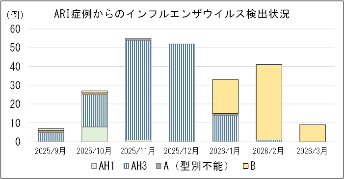 急性呼吸器感染症(ARI)サーベイランス(詳しくはARIサーベイランスが始まりました!をご覧ください)におけるインフルエンザウイルス検出状況は次のとおりです。