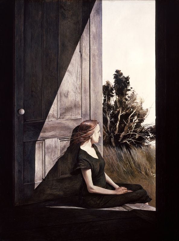 200点以上のワイエス作品でモデルを務めたクリスティーナ・オルソンを描いた作品。病気により足が不自由であった彼女は自由に歩き回ることが出来ませんでした。彼女は、陽の光あふれる外と暗い室内のちょうど境に腰を下ろし、内と外をつなぐ役目を与えられています。風になびく彼女の髪は、室内の静的な暗さと対照的に、明るく生命感のある外の空気の動きも表現しているようです。