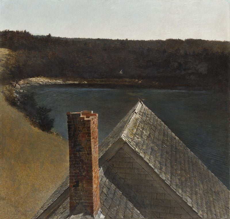 1967年から68年にかけての冬、オルソン姉弟が相次いで亡くなります。姉弟が亡くなって最初の夏、ワイエスはオルソン姉弟の家(オルソンハウス)を訪れて本作を描きました。複雑な海岸線が特徴的なメイン州。その入江のひとつに今でもオルソンハウスはひっそりと建っています。