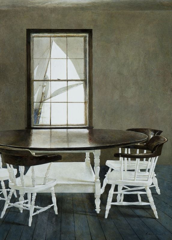 メイン州のワイエス夫妻が所有する島の無人の室内を描いた作品です。この部屋にいた人たちは窓の外に見えているヨットに乗船したのでしょうか。時の流れ、人の移動、さらに違う世界への旅立ちさえも想像させる世界が広がっています。