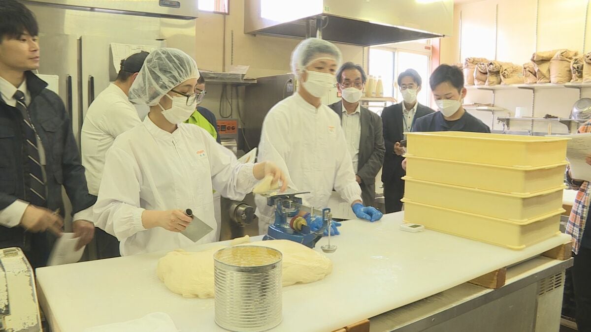 パンのレシピ提案や粉の品質チェックをするニップンの中央技術センターから講師が招かれ、県産小麦の「せときらら」を使ったコッペパンの作り方を紹介しました。