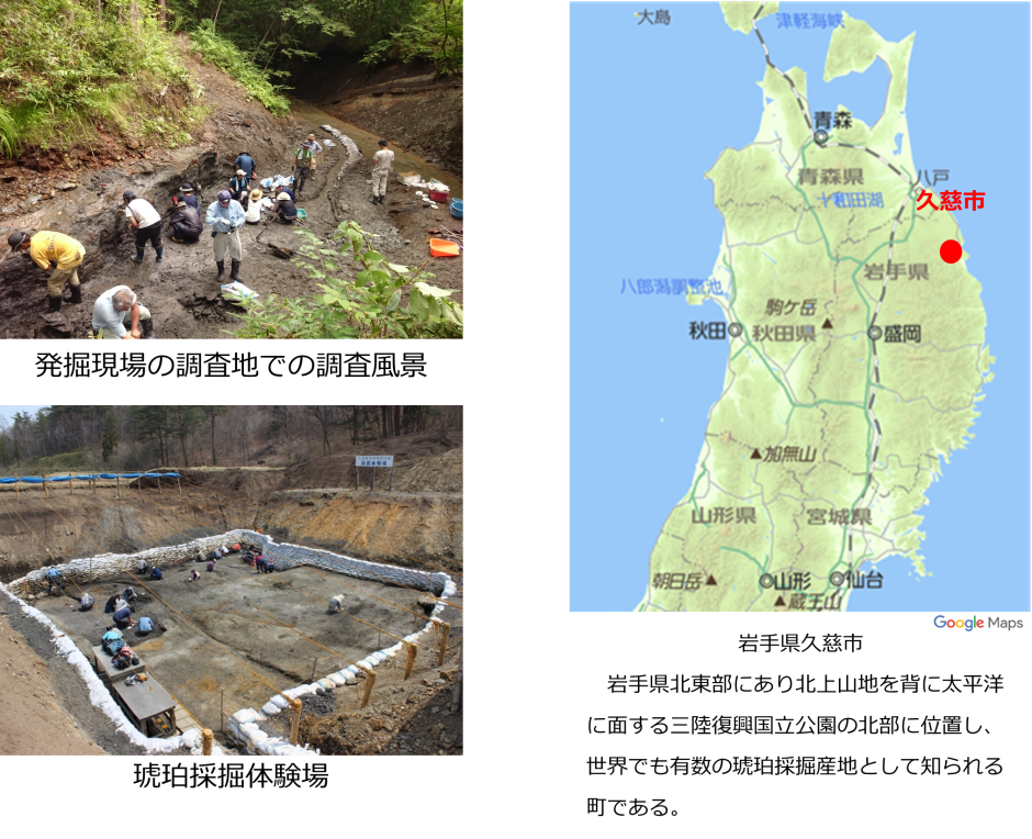 久慈琥珀博物館の琥珀採掘体験場および隣接する脊椎動物化石凝集層(ボーンベッド)からは今から約9000万年前の恐竜の歯化石や、カメ類やワニ類の骨格など30種類を超える脊椎動物化石が2025年8月現在で3700点以上も発見されており、日本の恐竜時代(中生代白亜紀)の生物相を解明するための重要な地域となっています。