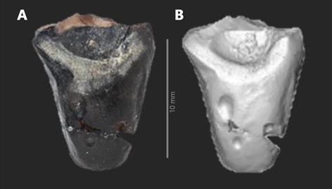 久慈層群玉川層から産出した角竜類の歯化石(OSD315)。A、化石の外側観; B、CTデータをもとに立体構築した3Dモデル