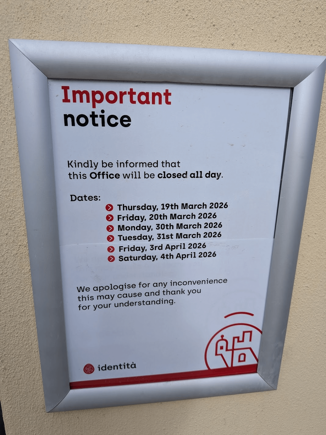 明日は祝日なので、長い週末を過ごすために、私も含めて今日は休みを取った人が多かったです。問題は、誰かが私に代わって仕事をしてくれているということですが、チームの全員が同じ日に休みを取るわけにはいかないということです…そうですね、公共事業体である Identita’ は長い週末を満喫したようです。こちらはマルサのパスポートオフィスです。定休日は月曜日で、営業時間は通常の平日で、営業時間は07:30~14:00です。