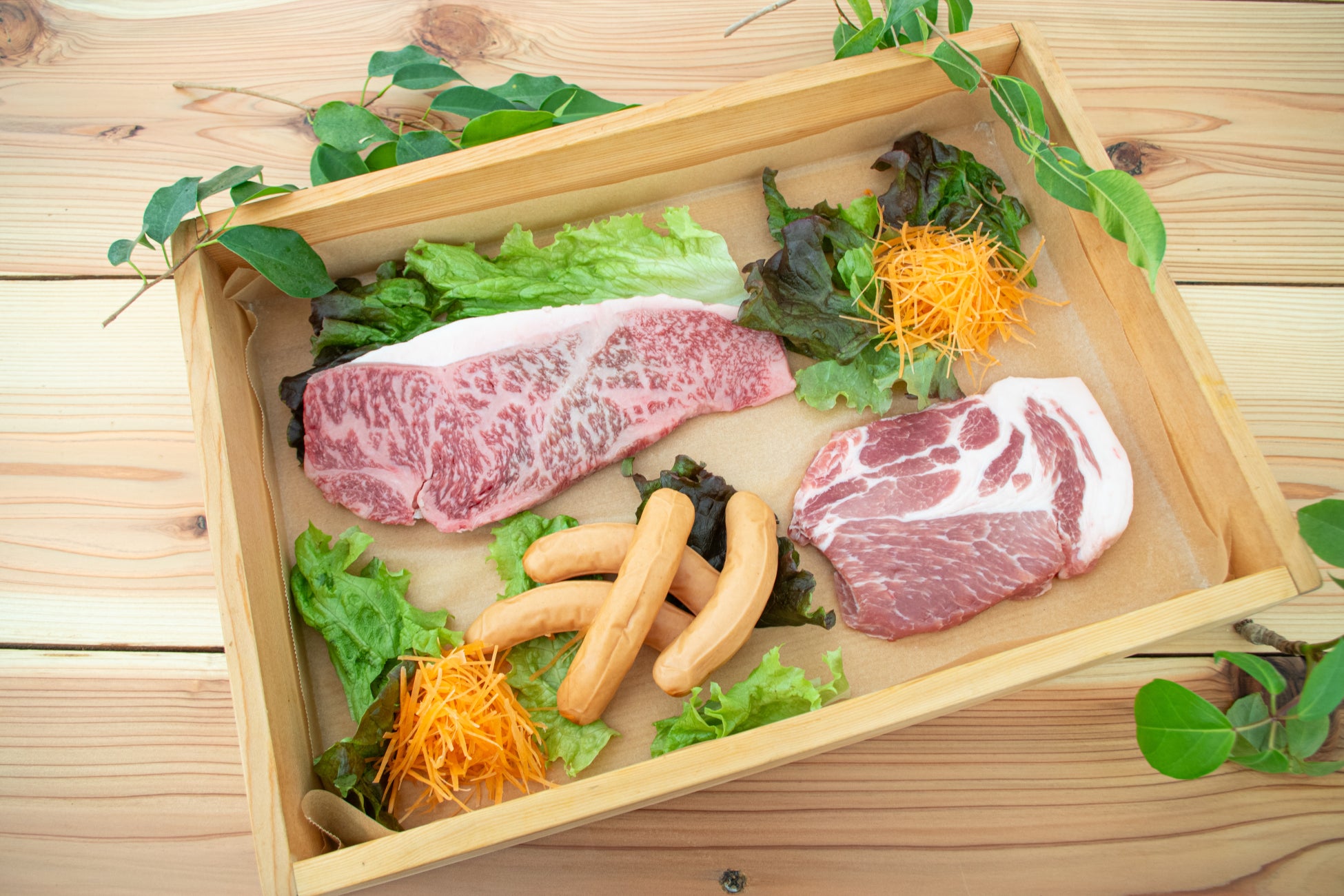 赤城牛のお味を存分に味わっていただけるよう贅沢に厚切りカット。備長炭鉄板でお好みに焼いて、仕上げにフランベで香り付けすれば、焼いても食べても大満足間違いなしの1品です。さらに、群馬県産豚の肩ロースと福豚ポークソーセージもご用意。群馬の味覚が詰まったお重をご堪能ください。
