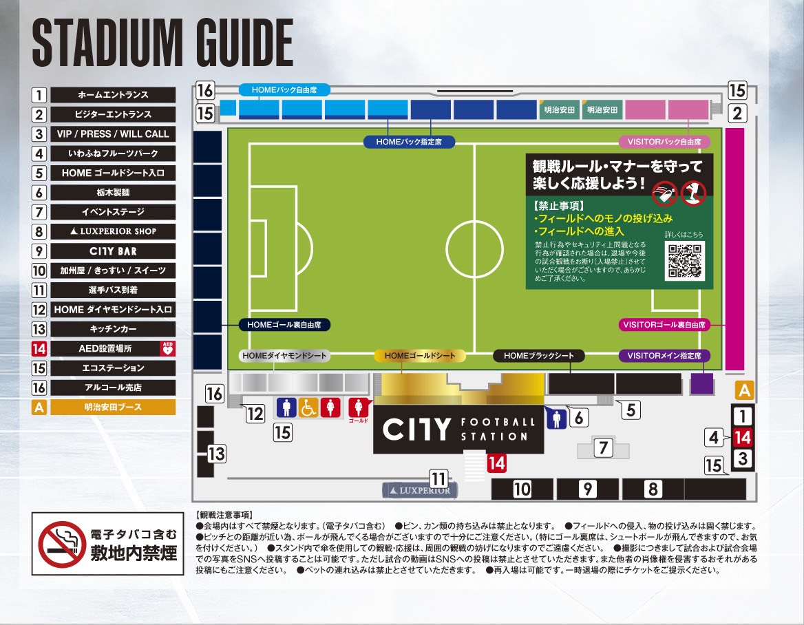 ご来場にあたりましては、管理規約および各種禁止事項等を遵守いただくとともに、警備員の指示、案内、誘導に従ってきただき、来場された皆様が気持ちよく観戦できるよう、ご理解・ご協力のほどお願いいたします。