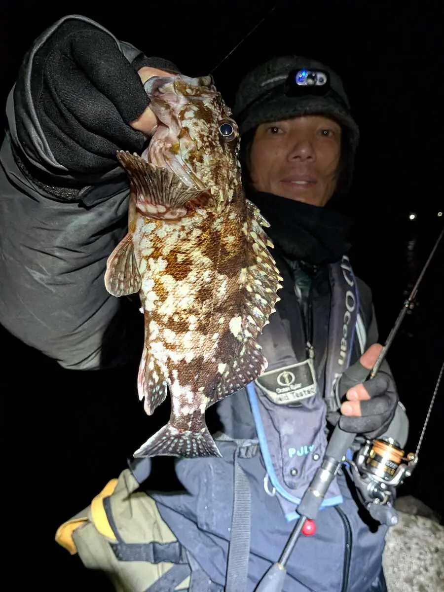少しポイントを移動し、底の地形がゴツゴツとしたポイントで再トライ。ルアーを泳がせるレンジも底付近を意識し、イチ、ニ、サンとカウントを数え、ルアーを沈めてから誘っていく。すると「キタ、キター」と釣友の田中さんのロッドが大きく締めこまれ、この日一番のビッグファイト。底に潜ろうと抵抗する良型を強引に浮かせて、キャッチしたのは、陸っぱりサイズでは良型の25センチサイズのガシラ。