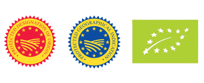 左から、原産地呼称保護(PDO)、地理的表示保護(PGI)、EUオーガニック認証を示す各ロゴ
