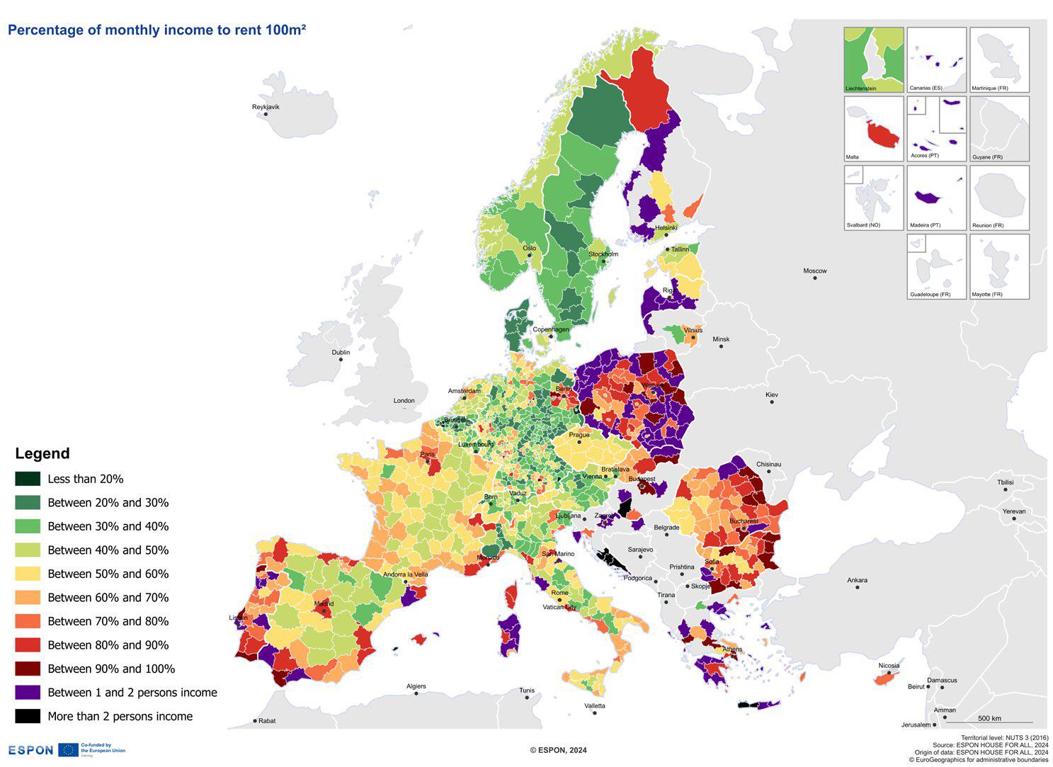 ヨーロッパで 100 平方メートルを借りるための月収の割合。