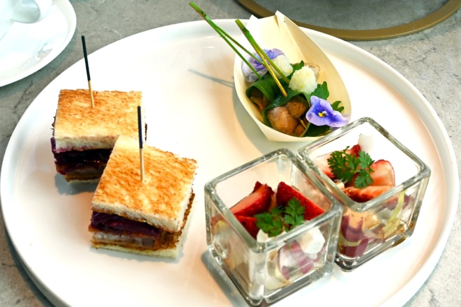 「いちごのカツサンド」「但馬の味どりの焼鳥 緑茶の瞬間燻製」「いちごとフェタチーズのアンディーブサラダ」 「ダブルツリーbyヒルトン大阪城」