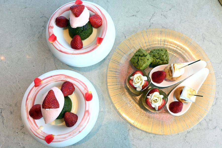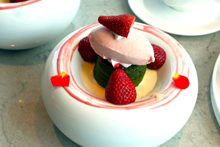 「いちごと抹茶のフォンダンショコラ」や「いちごと煎茶ガナッシュ ほうじ茶ジュレ」は上から撮影しても美しい盛り付けで登場する
