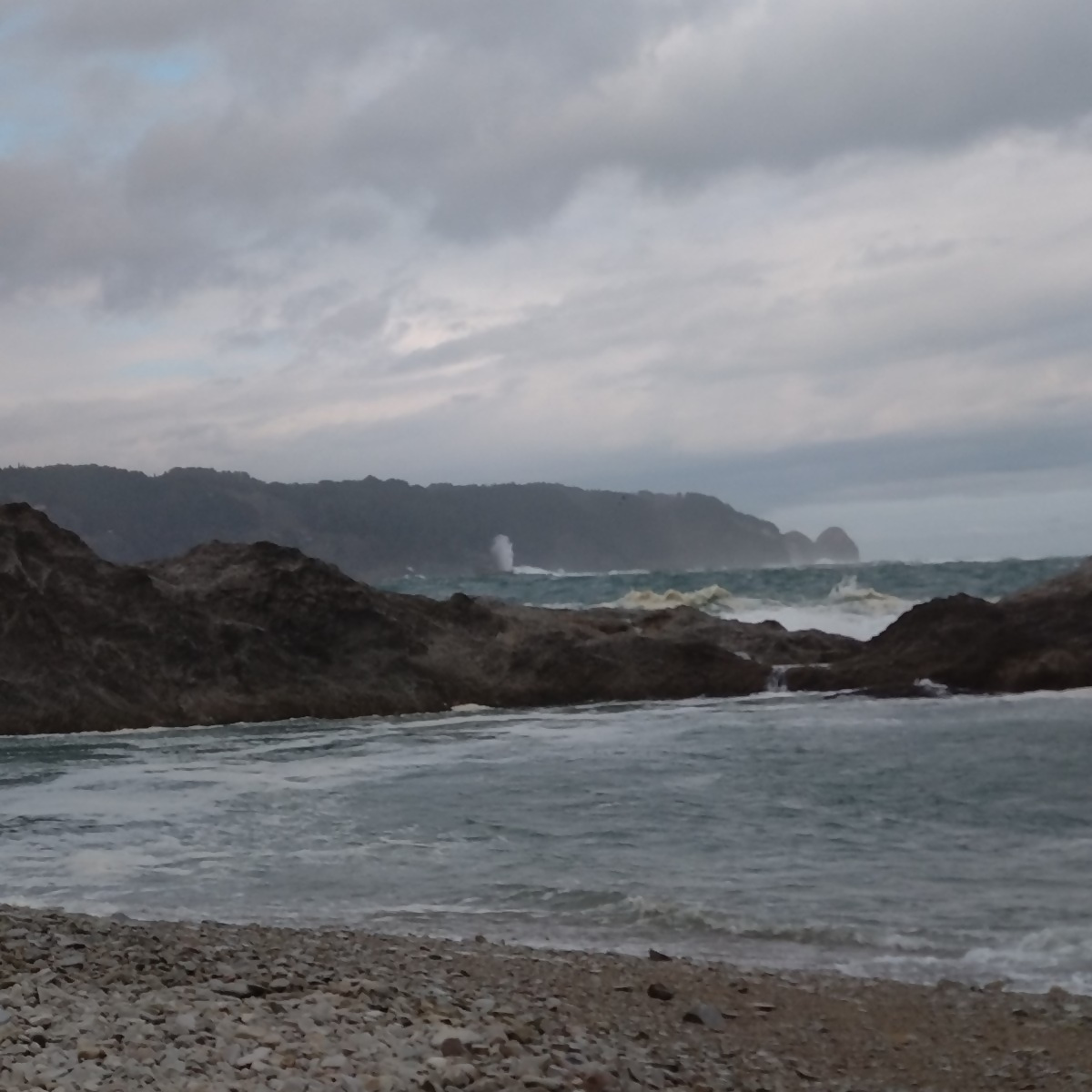 海が荒れている日は、浄土ヶ浜からも噴き上がる様子を見ることが出来ます。荒れている同じ日に、浄土ヶ浜から見た潮吹穴の様子と、現地での両方を見比べてみました。